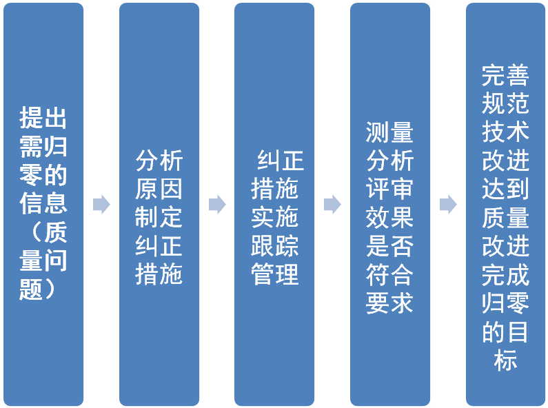 提出需归零的问题是过程的输入,分析原因、机理,确定质量问题发生的准确部位,采取措施,举一反三,正确处理,进行评审和验证是过程的活动,完善规范,技术改进,完成纠正措施并达到质量改进的全过程。