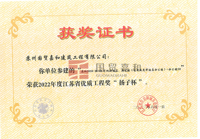 “苏地2010-B-48号地块酒店、办公楼”荣获22022年度江苏省优质工程奖“扬子杯”