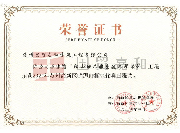“阳山幼儿园重建工程装饰”工程 荣获2024年苏州高新区“狮山杯”优质卫程