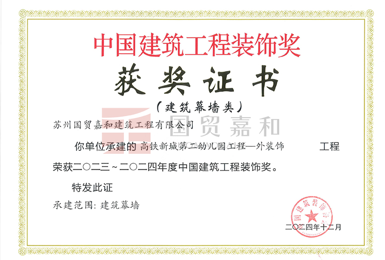 高铁新城第二幼儿园工程-外装饰荣获二〇二三~二〇二四年度中国建筑工程装饰奖